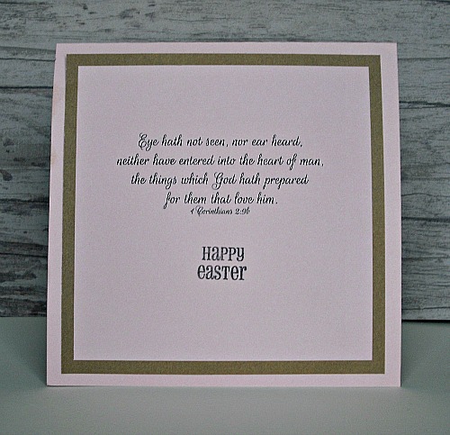 I stamped "Happy Spring" using the selective inking technique to take off the little bunny. I tied the button onto the bow using Baby Pink Embroidery Floss.